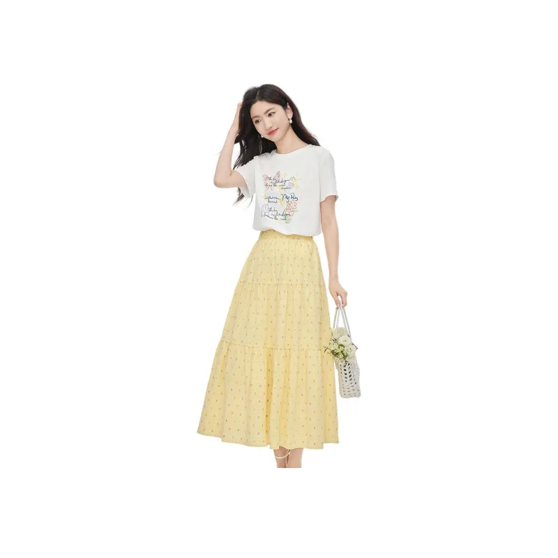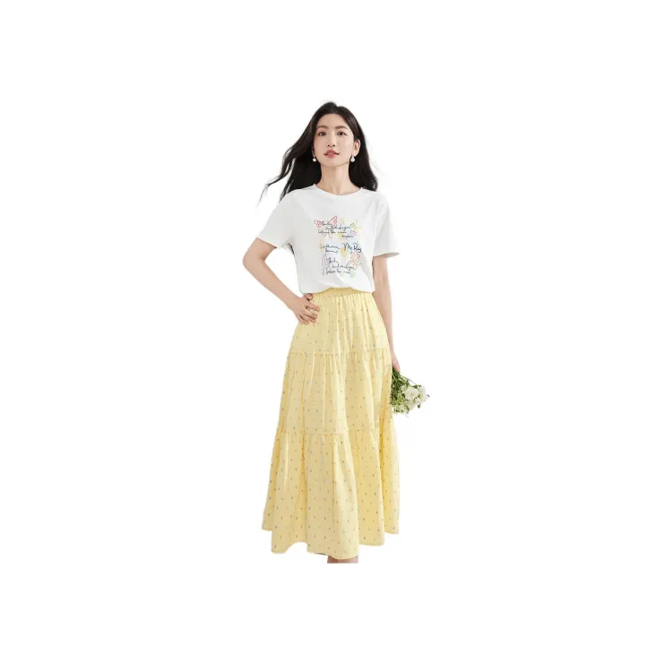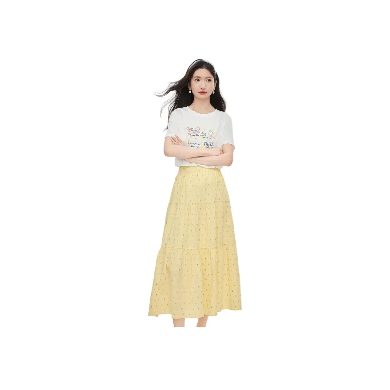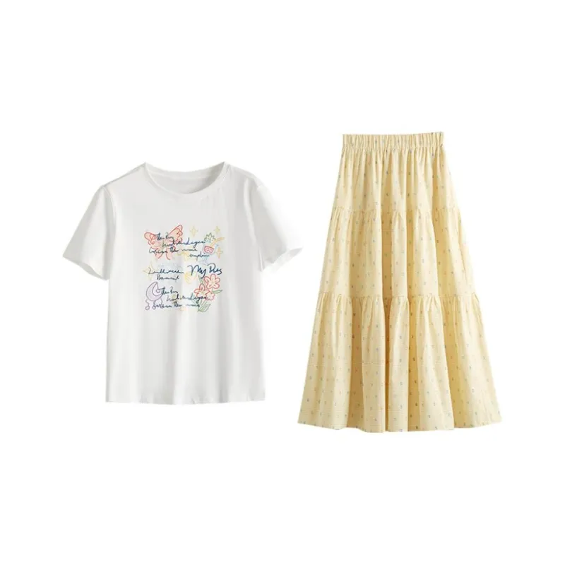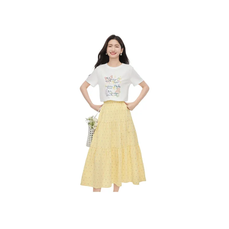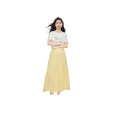 "라이트 옐로우: 티셔츠 주요 소재: 72.4% 면, 27.6% 폴리에스터; 성분 함량 2: 스커트 주요 소재: 57.8% 면, 32.5% 재생 셀룰로오스 섬유, 9.7% 폴리에스터 (기타 섬유 소량 함유); 안감: 100% 폴리에스터"
