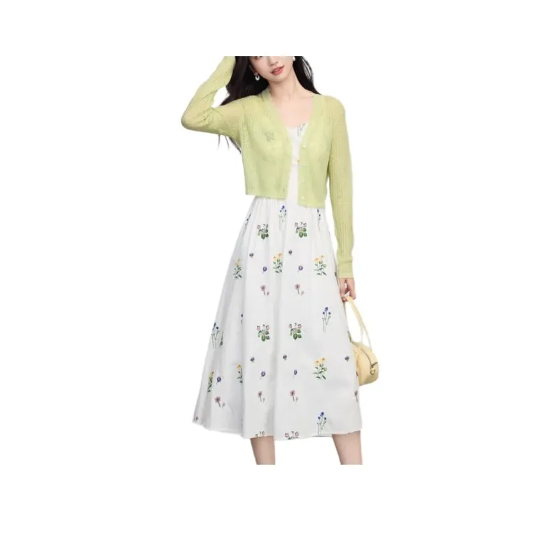 SLLSKY 여름 그린 니트웨어+펄 화이트 캐미솔 드레스 여성 투피스 스커트 세트 - POIZON