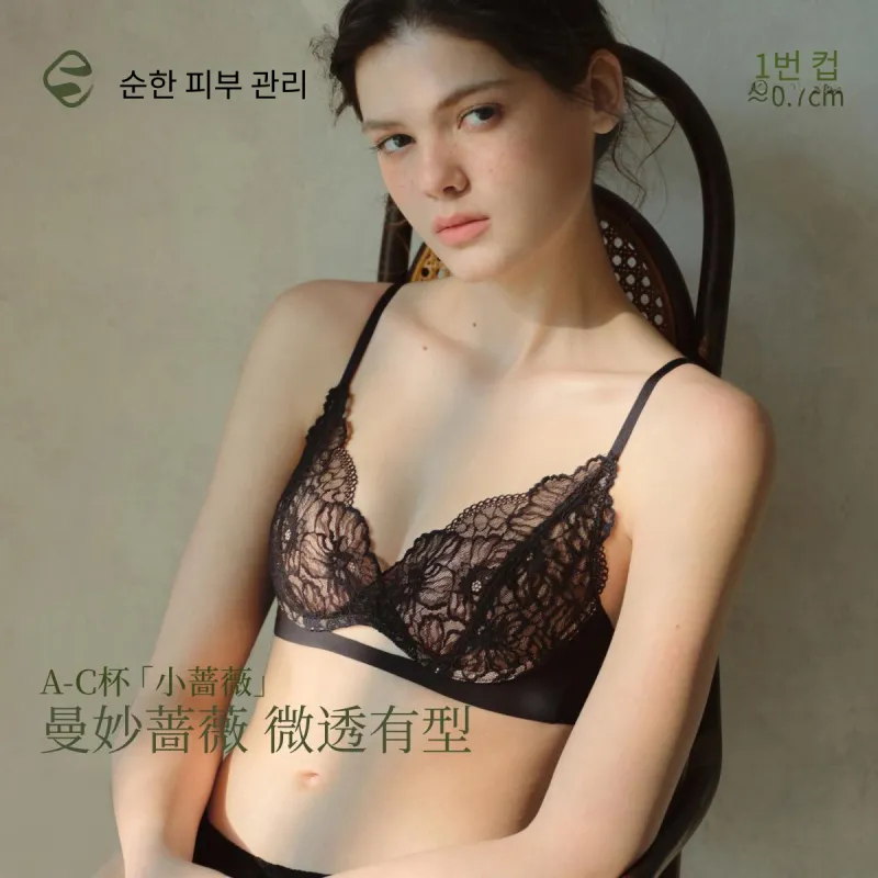 레이스 원단: 89.1% 폴리아미드, 10.9% 스판덱스 하단 둘레 원단: 64.5% 폴리아미드, 35.5% 스판덱스 컵 안감: 100% 폴리에스터