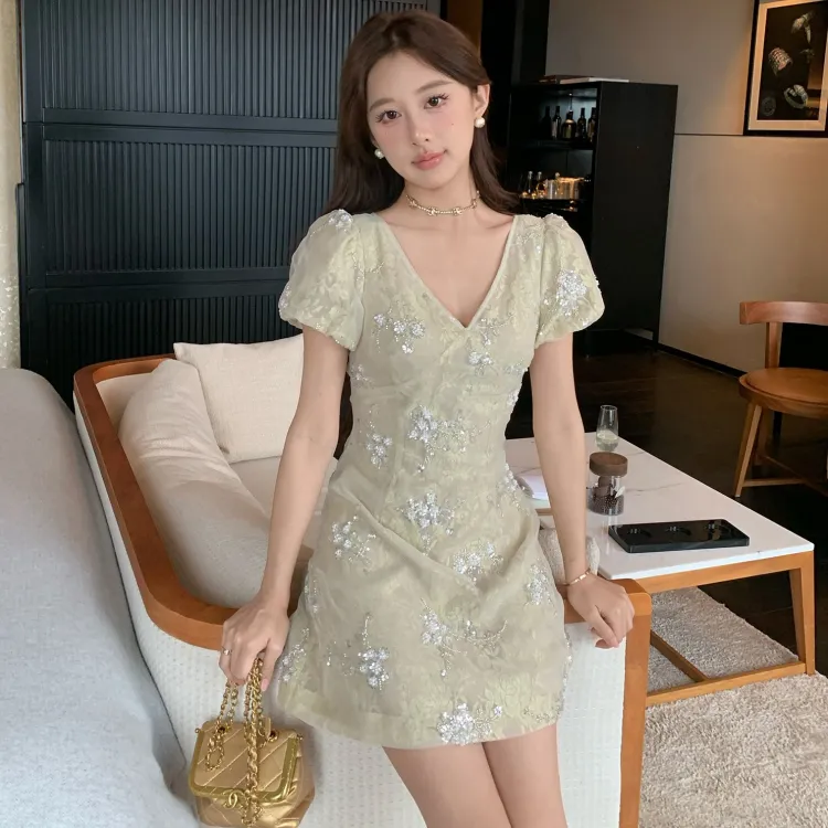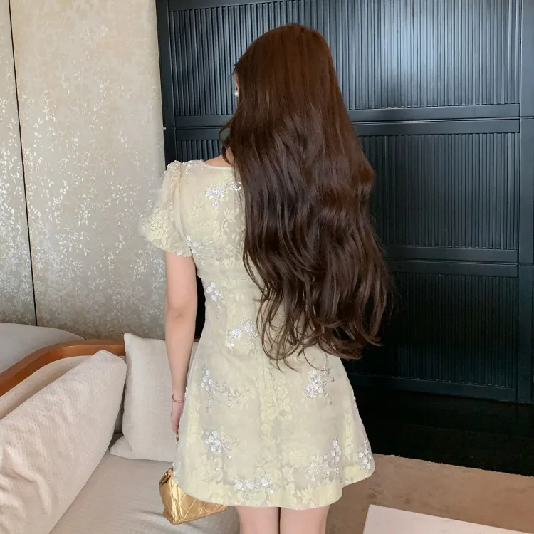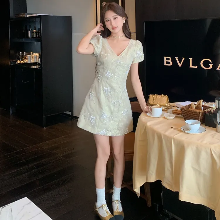 Summer Hooray 가을 그린 옐로우 여성 반팔 원피스 - POIZON