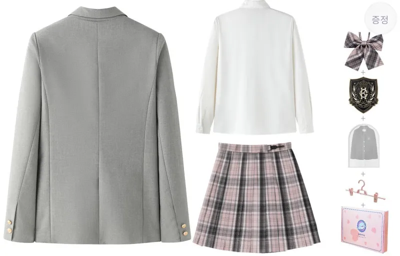 다크 블루 수트: 겉감: 76.4% 폴리에스터, 23.6% 비스코스 (접착제 포함), 기본 원단: 100% 폴리에스터, 안감: 100% 폴리에스터. 블랙 수트: 겉감: 77.3% 폴리에스터, 22.7% 비스코스 (접착제 포함), 기본 원단: 100% 폴리에스터, 안감: 100% 폴리에스터. 폴리에스터. 폴리에스터. 그레이 수트: 아우터 원단: 79% 폴리에스터, 21% 비스코스 (접착제 포함), 밑감: 100% 폴리에스터, 안감: 100% 폴리에스터, 가디건: 100% 순면, 블라우스: 80.7% 폴리에스터, 19.3% 비스코스.