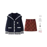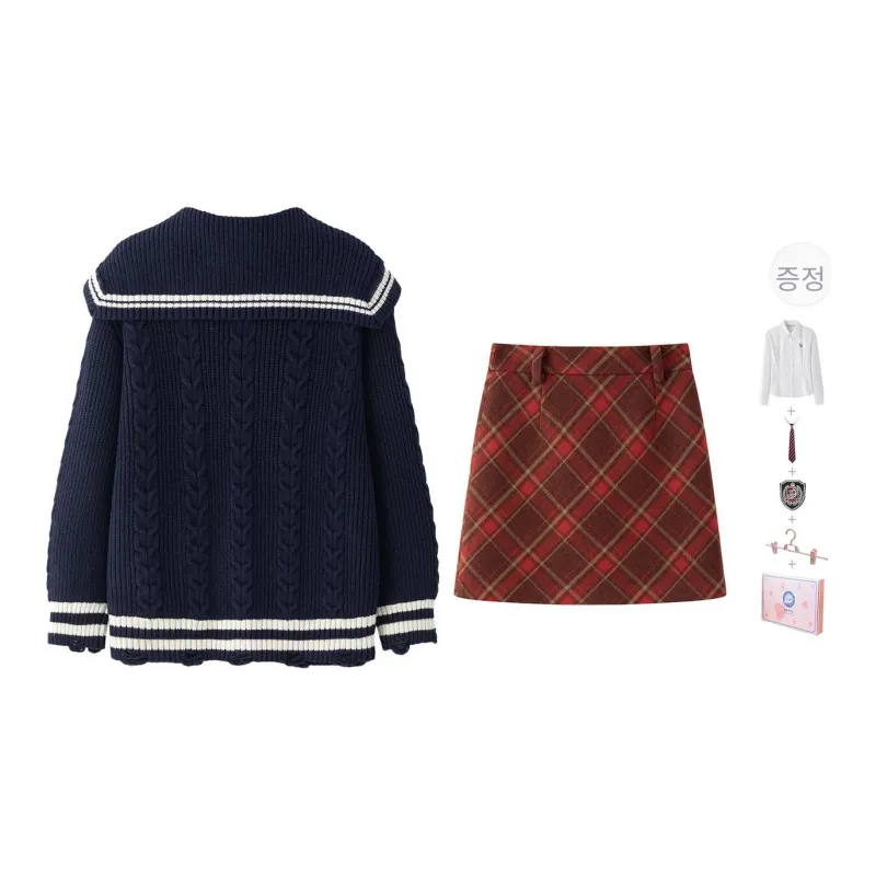 세트:의류 세트 (네이비 블루 루즈핏 스웨터 + 레드 바디콘 스커트) 포함, 무료 블라우스 + 배지 + 넥타이