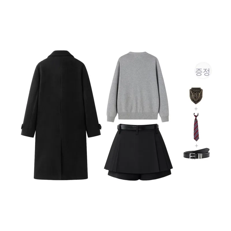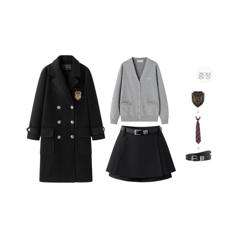 블랙 코트 + 블랙 스커트 바지, 포함됨 가디건 + 블라우스 + 보타이 + 벨트 + 배지