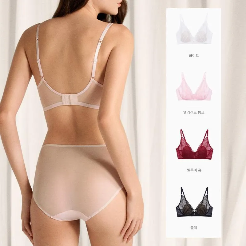 레이스: 72% 폴리에스터 + 28% 메탈 코팅 섬유; 윙: 68% 폴리아미드 + 32% 스판덱스; 안감: 100% 폴리아미드; 측면 핸들: 100% 폴리아미드; 컵 안감: 100% 폴리에스터