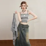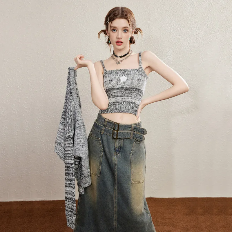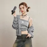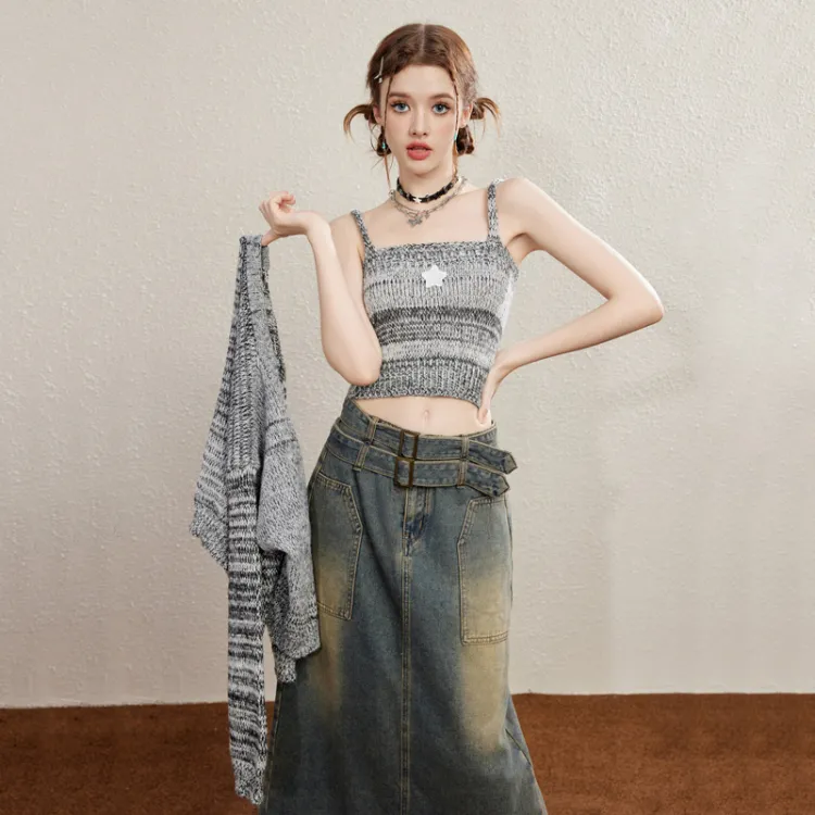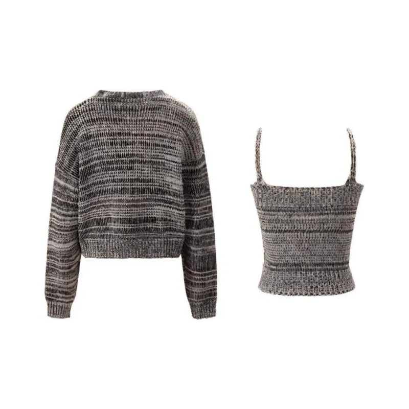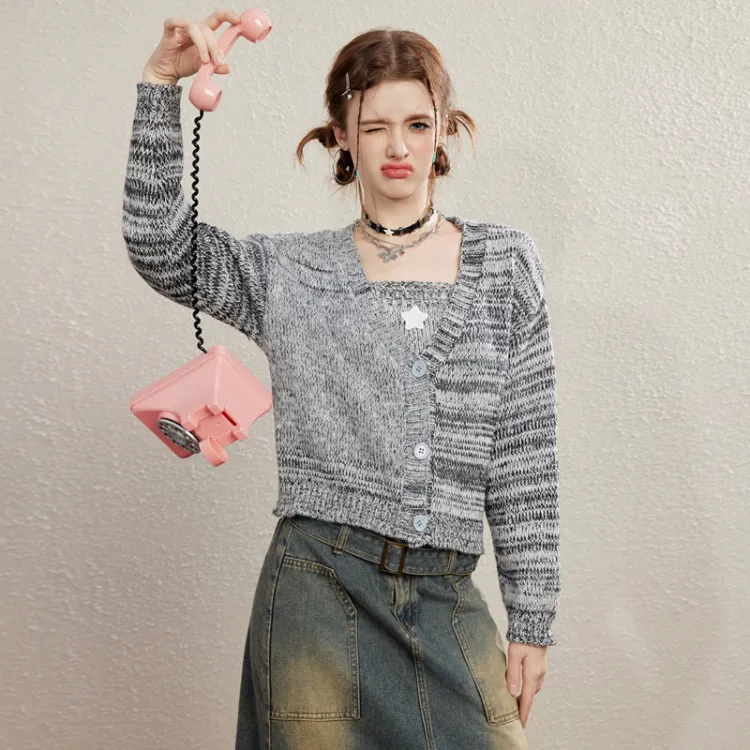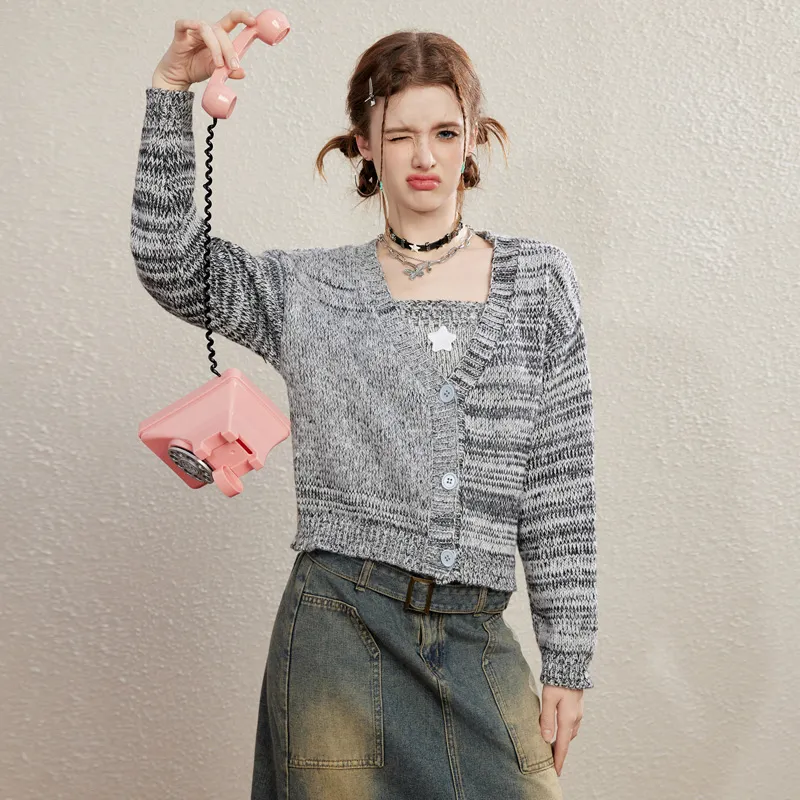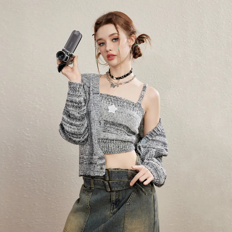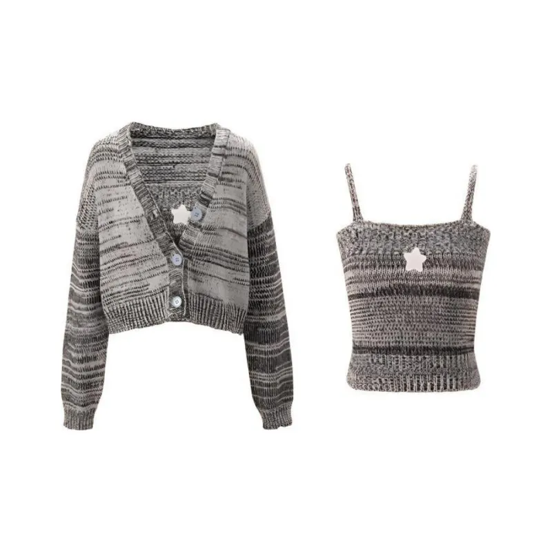 Unifree 니트 원단 가디건 탱크탑 2개 세트 여성 그레이 - POIZON