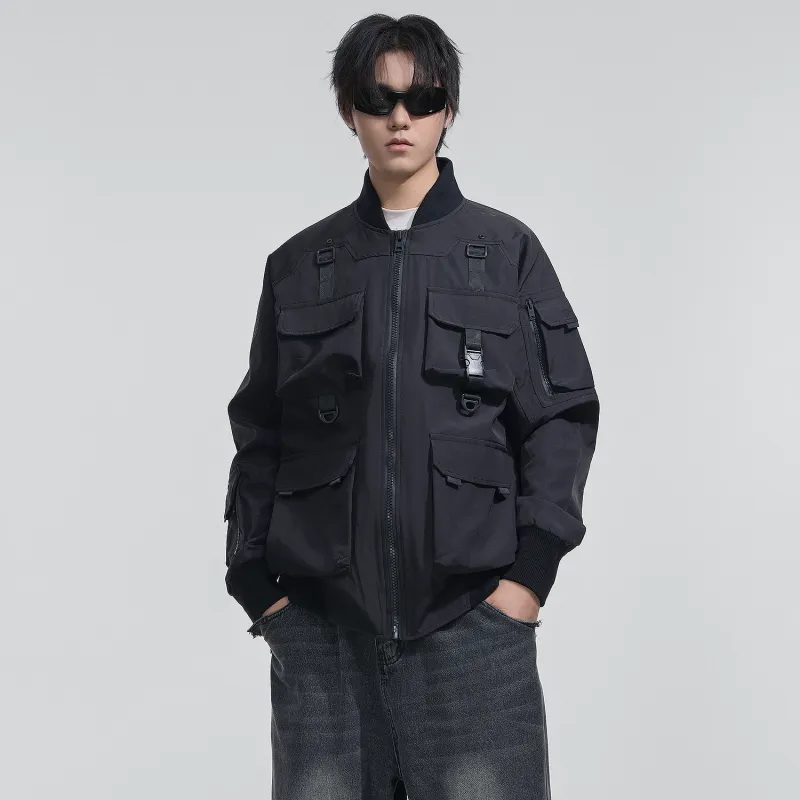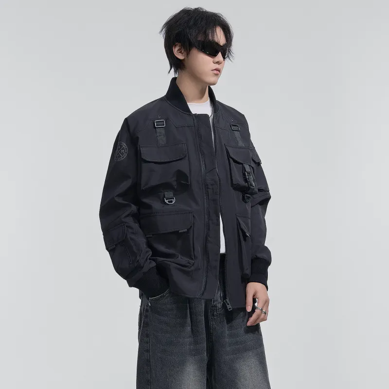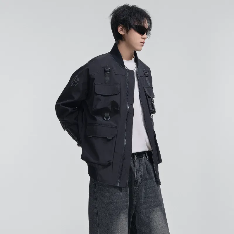 VIP 단색 로고 레터링 도시 테크웨어 멀티 포켓 워크웨어 비행 재킷 남성 블랙