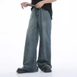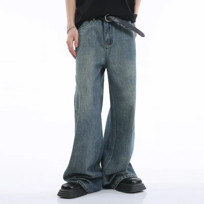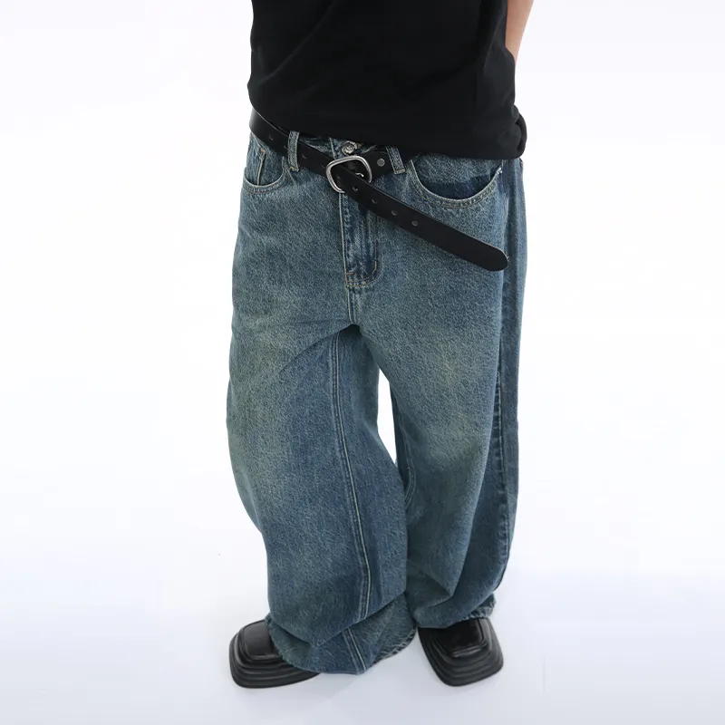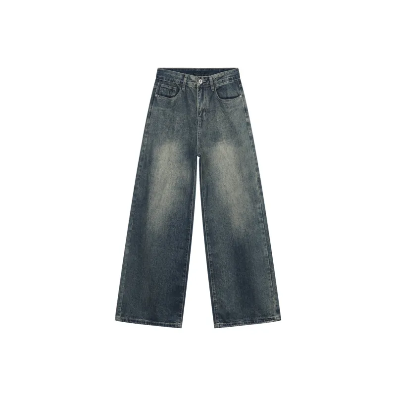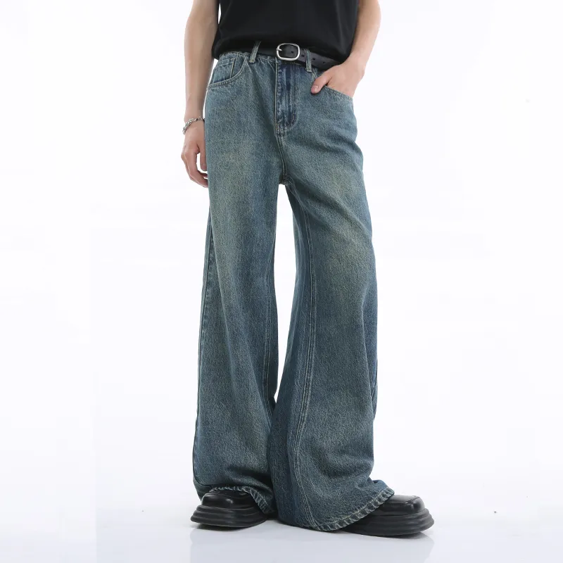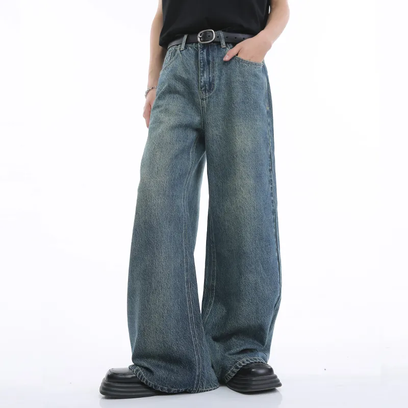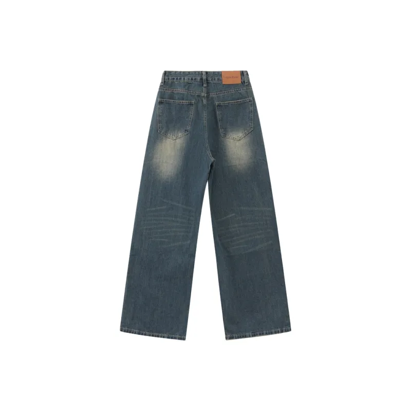 Voguo Relay 배기 청바지 기장 추가 바닥 길이 와이드 팬츠 남녀공용 빈티지 다크 블루