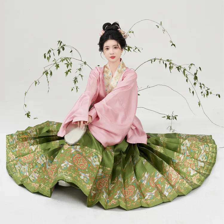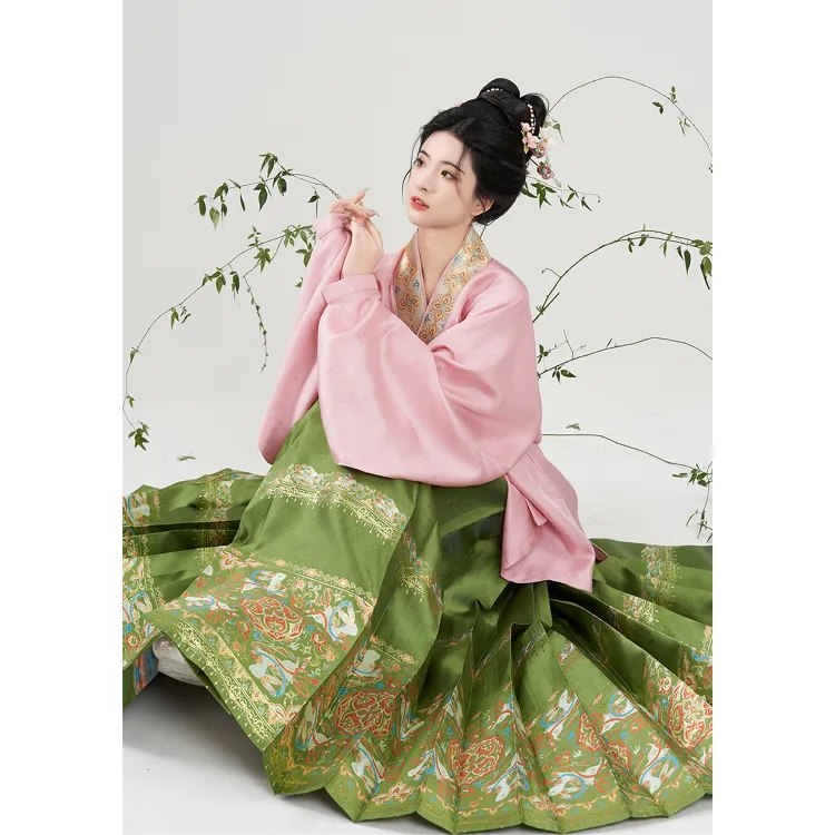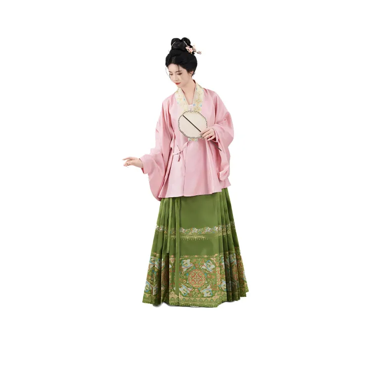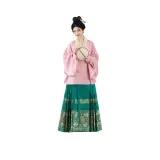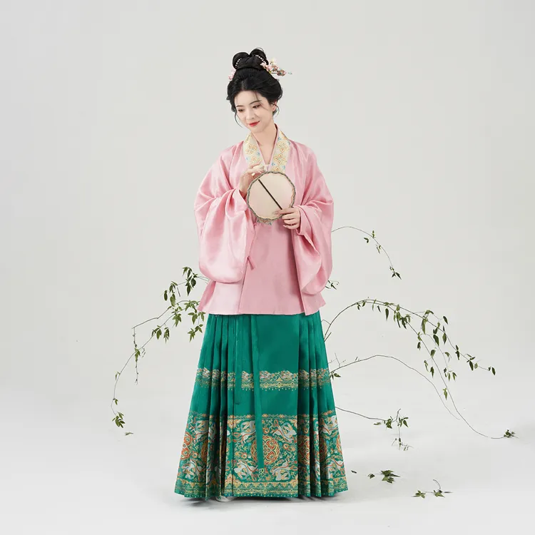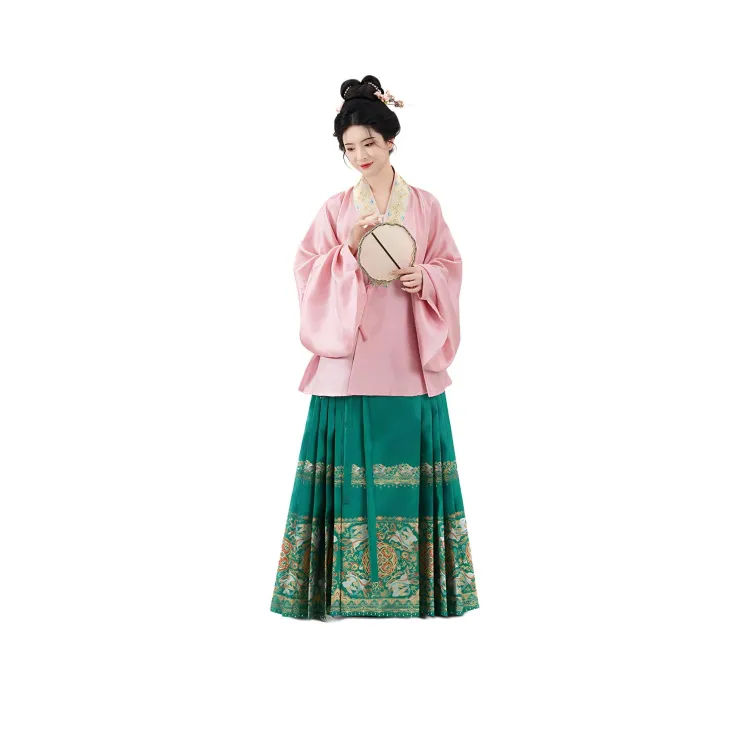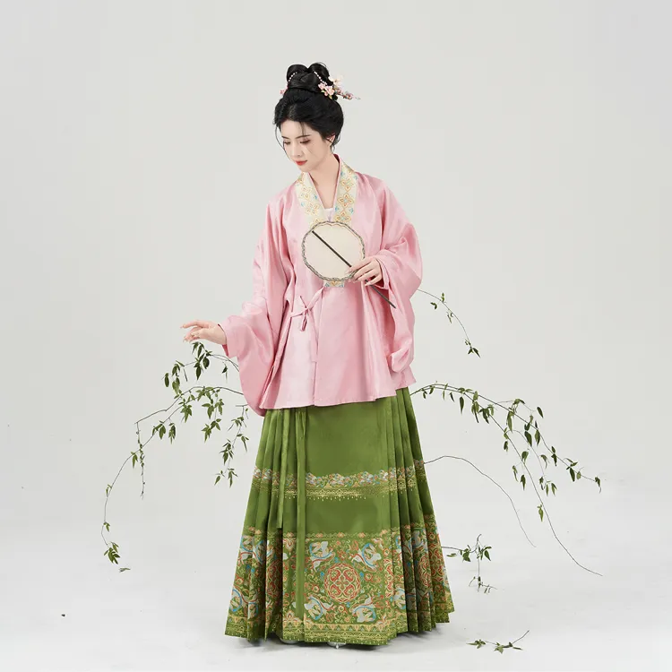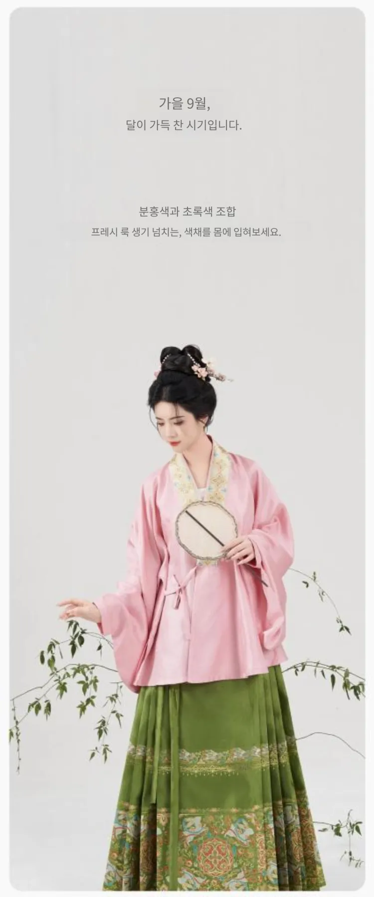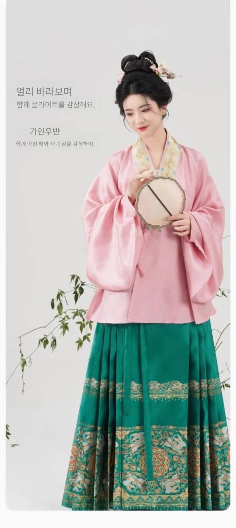 2종 세트 (핑크 십자-오버 상의 + 그린 말-페이스 스커트)