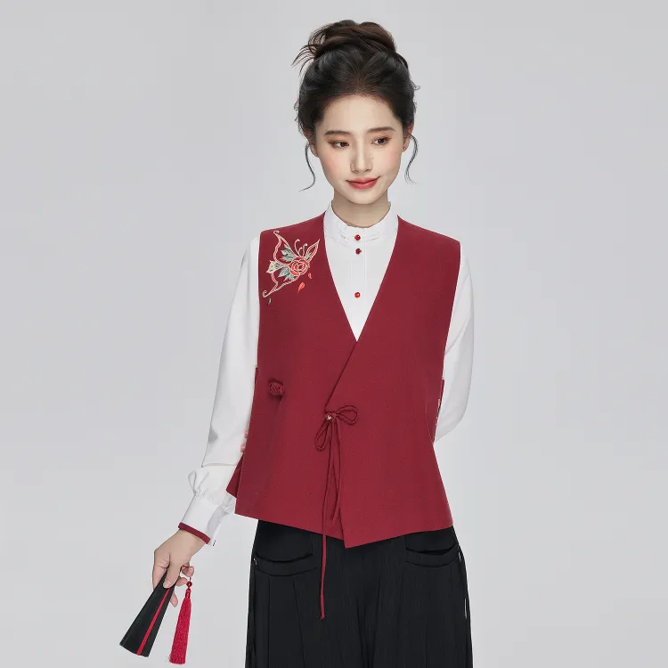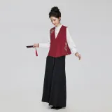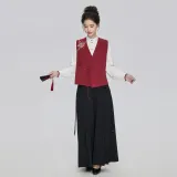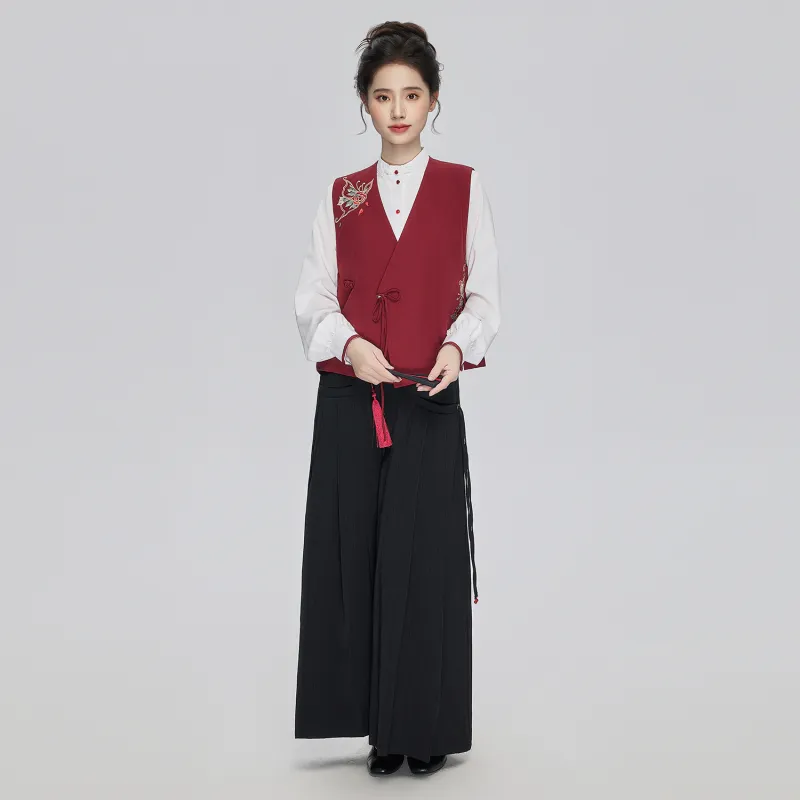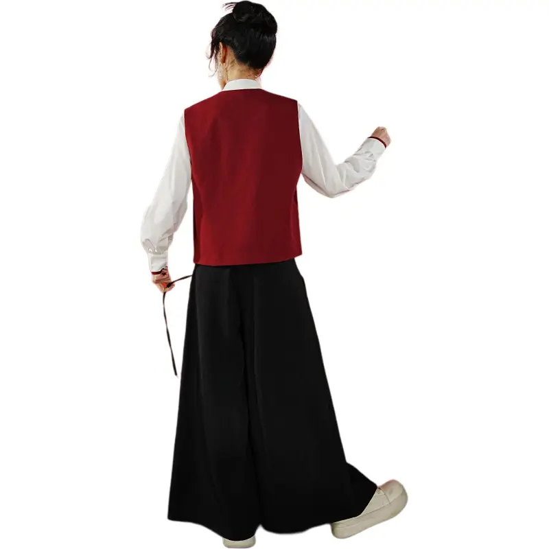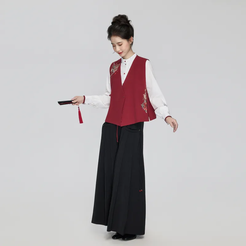 XINGHEHANGE 신형 중국 블라우스 레드 조끼 신형 중국 와이드 다리 바지 Drape Improved Song 바지 National 스타일 캐주얼 수트 여성 - POIZON