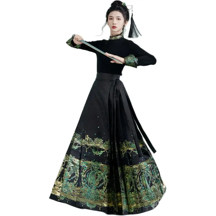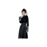 XINGHEHANGE 스탠드 카라 긴팔 슬림핏 한푸 마면치마 티셔츠 여성 블랙