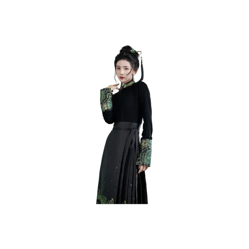 XINGHEHANGE 스탠드 카라 긴팔 슬림핏 한푸 마면치마 티셔츠 여성 블랙 - POIZON