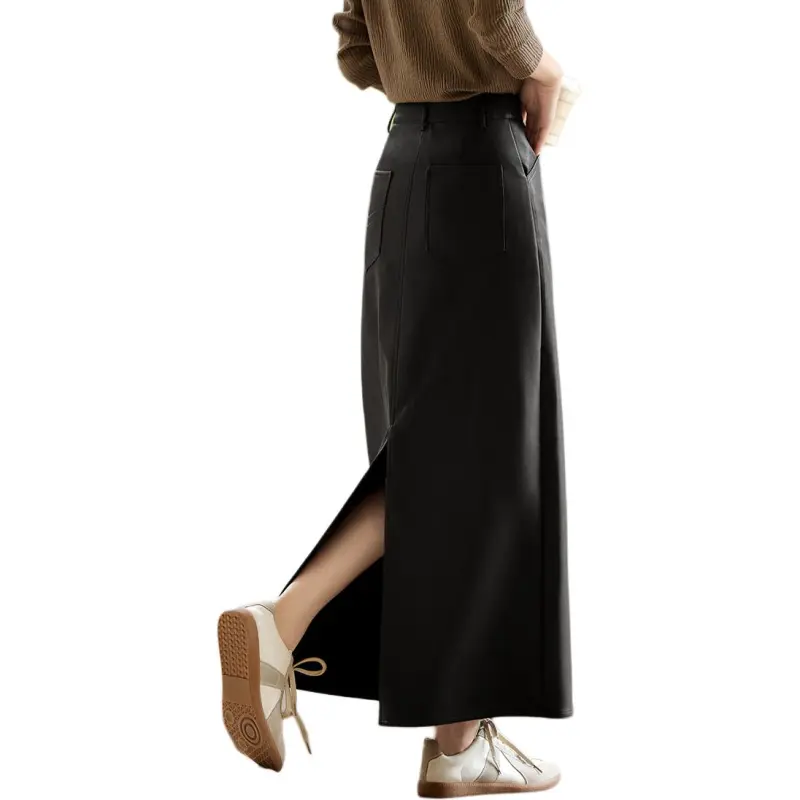 XWI 블랙 여성 가죽 롱 스커트 - POIZON