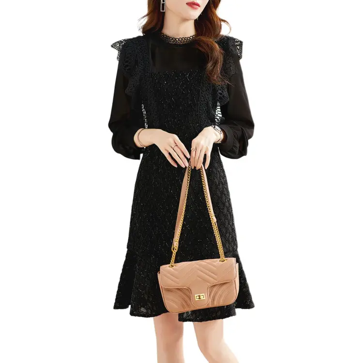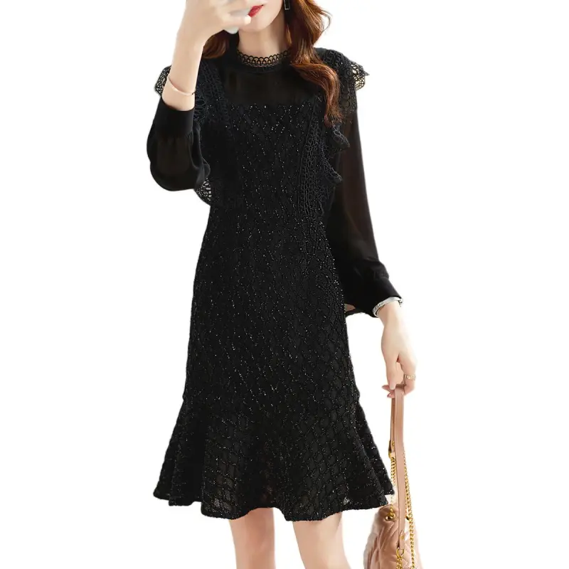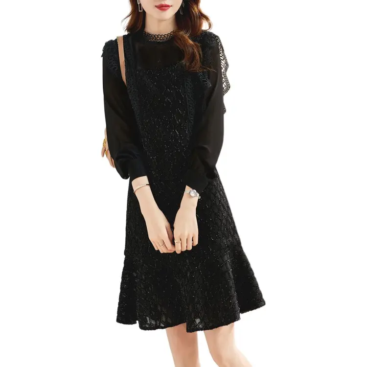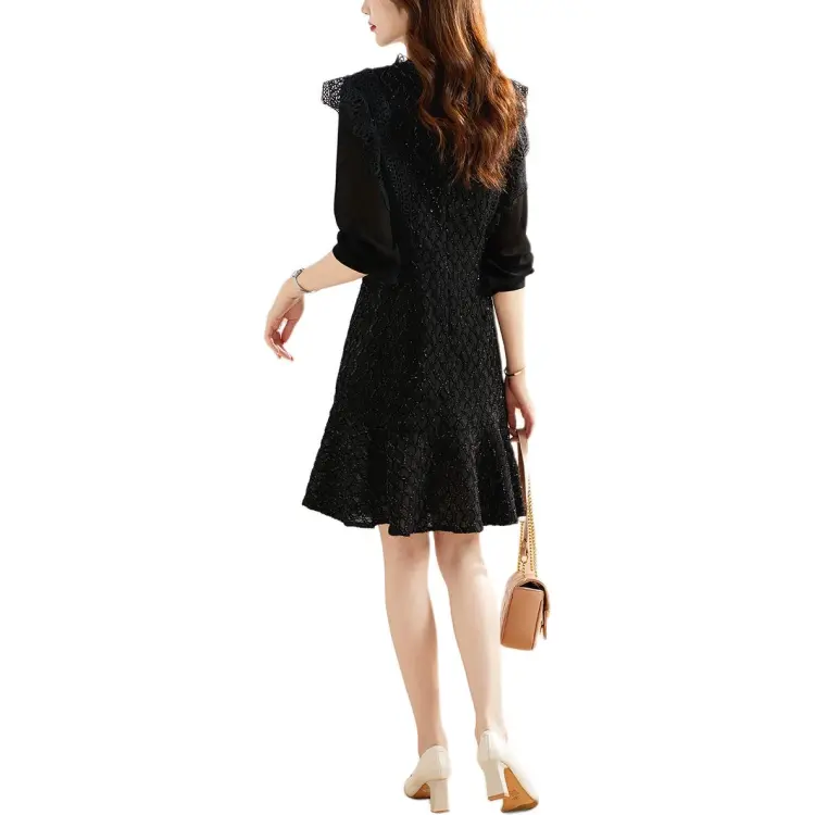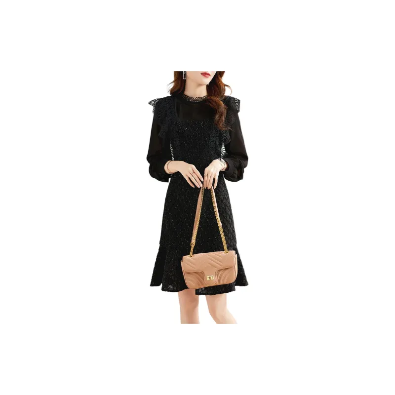 XWI 잉크 블랙 여성 긴팔 원피스 - POIZON