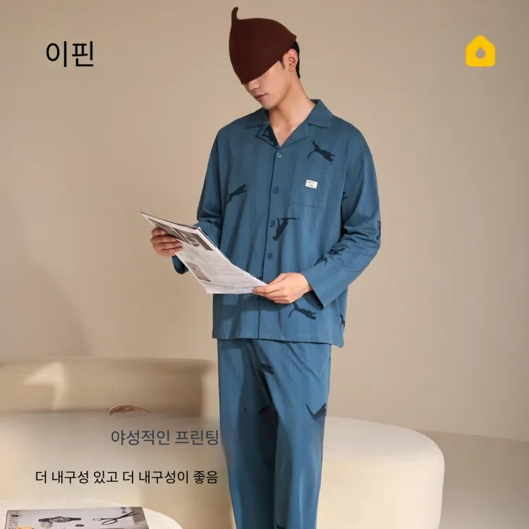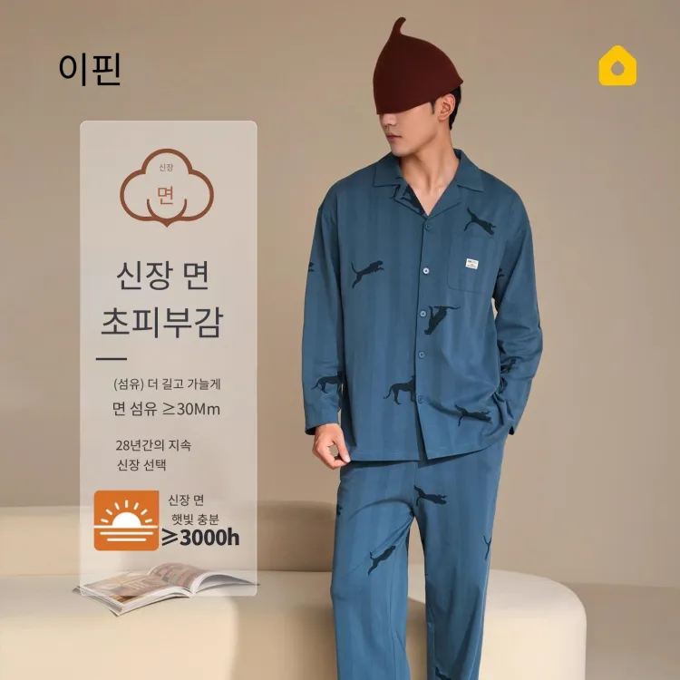 Yi Fen 블루 스트라이프 패턴 표범 남성 파자마 세트